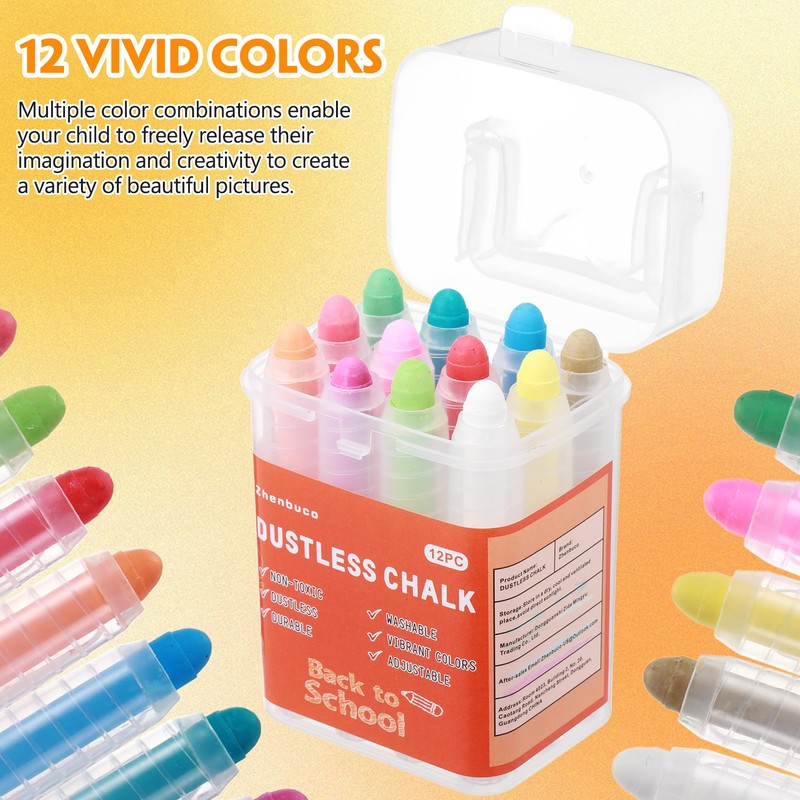 Zhenbuco Dustless Chalk for Kids - 12 PCS Twistable Non-Toxic Washable Sidewalk Chalk with Holder | Unique Art Tool for Outdoor & Indoor Blackboard Fun | Packed in Plastic Box