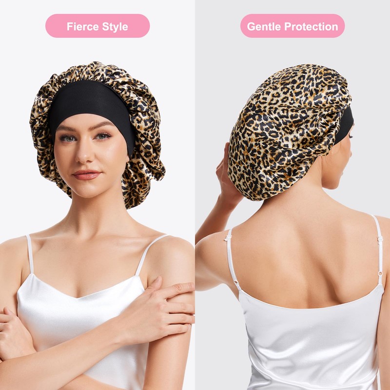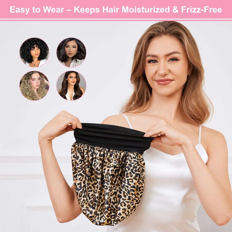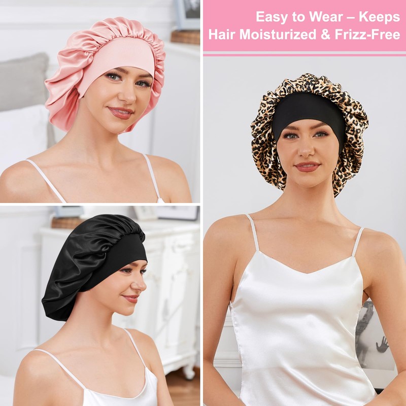 ZHENSILK 3PCS Silk Sleep Bonnet for Women, Large Satin Hair Caps with Elastic Band, Curly Hair Wrap for Sleeping, Frizz Protection (Black, Light Pink, Leopard Print)