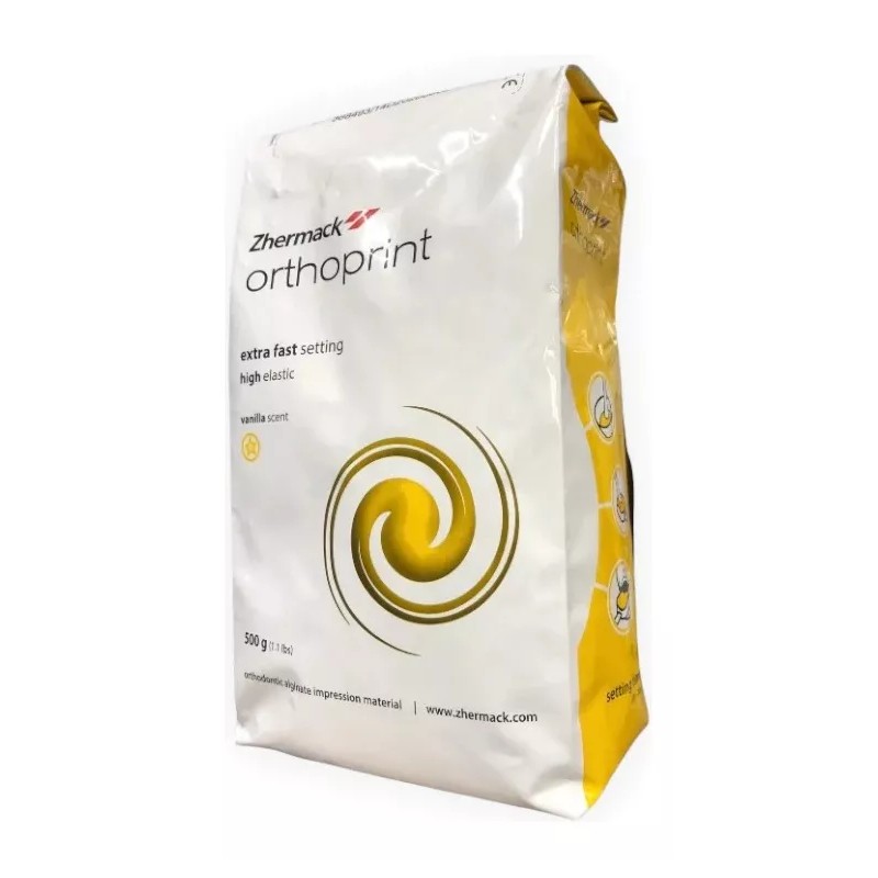 Orthoprint rápida absorción del agua, fácilmente mezclable, larga conservación de las impresiones. Características alginato sumamente elástico, tiempos de trabajo y polimerización extra rápidos, tixotrópico, no gotea, agradable aroma de vainilla con reducción del reflejo emético, color amarillo, libre de polvo en suspensión