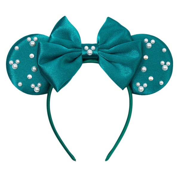 zhezesmila Satin Mouse Ears Headband for Women & Girls with Double-layer Bows Shiny Pearl Rhinestone Ears Hairband for Party & Vacation