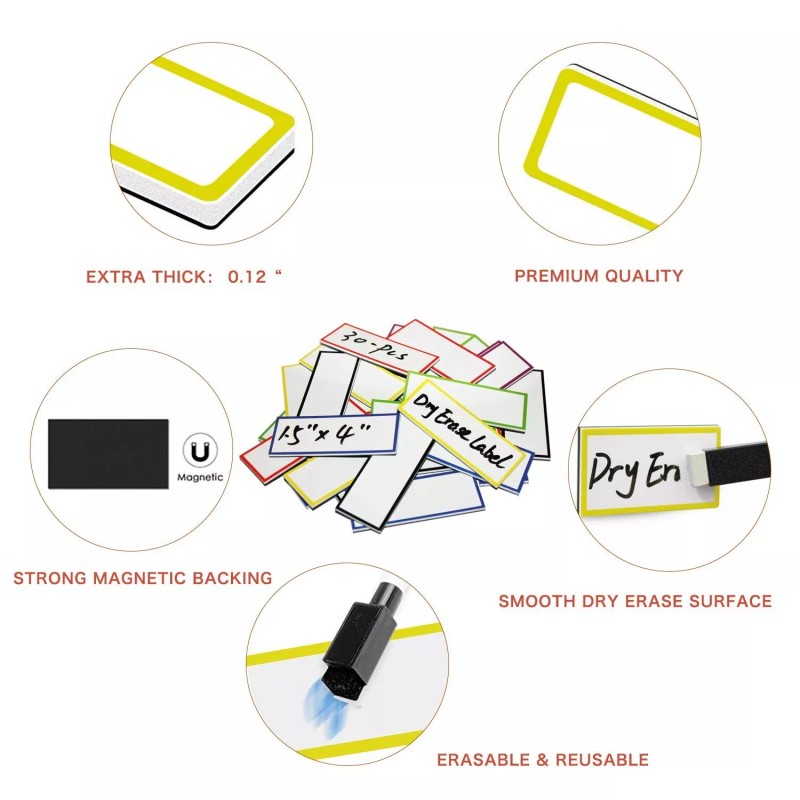 - INCLUDES: Pack of 30 Dry Erase Magnetic Labels / Name Plates, 1.5 x 4 inches. Tips: Not suitable for glass board!