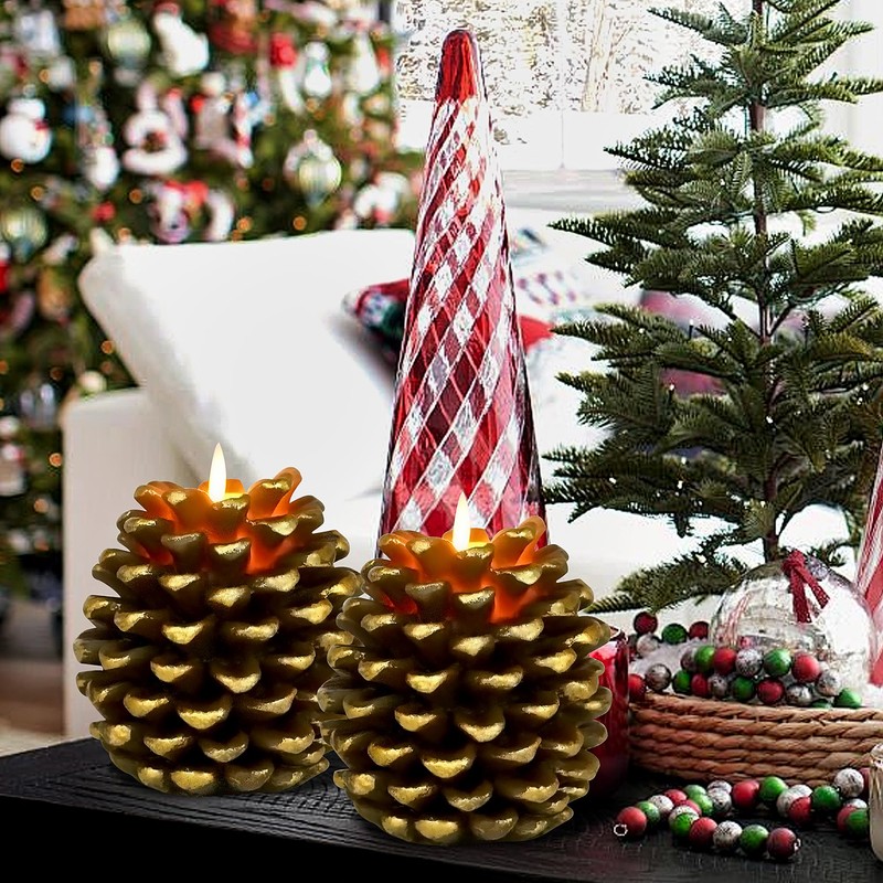 Zhitaoxun Pinecone Candles Flameless,Pine Cone Flameless Flickering Candles, Battery Operated Flameless Candles with Timer,Christmas Home Party Decoration (2)