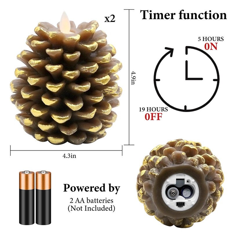 - 𝐏𝐚𝐜𝐤𝐚𝐠𝐞𝐝:Includes 1/2PC 4.3-inch diameter, 4.9-inch tall flameless pine cone candles—just the right size to make a statement on any table or shelf. With an impressive battery life of up to 200 hours on just 2 AA batteries (not included), these candles provide long-lasting illumination