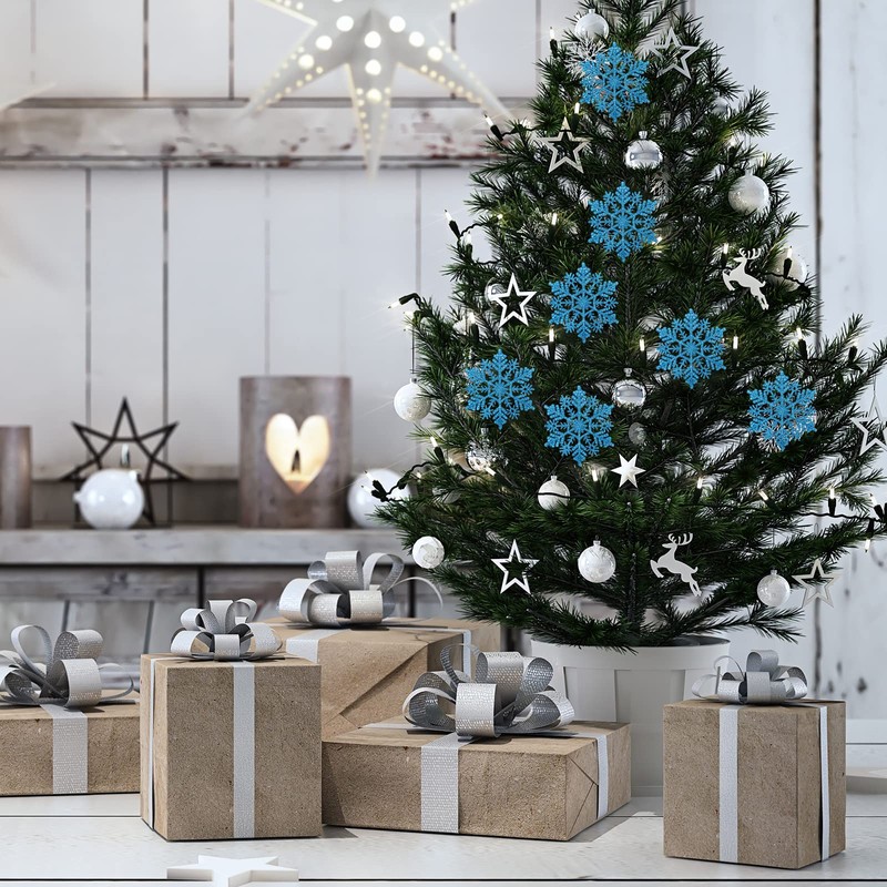 • 30 piezas de adornos de copos de nieve azules brillantes con purpurina.