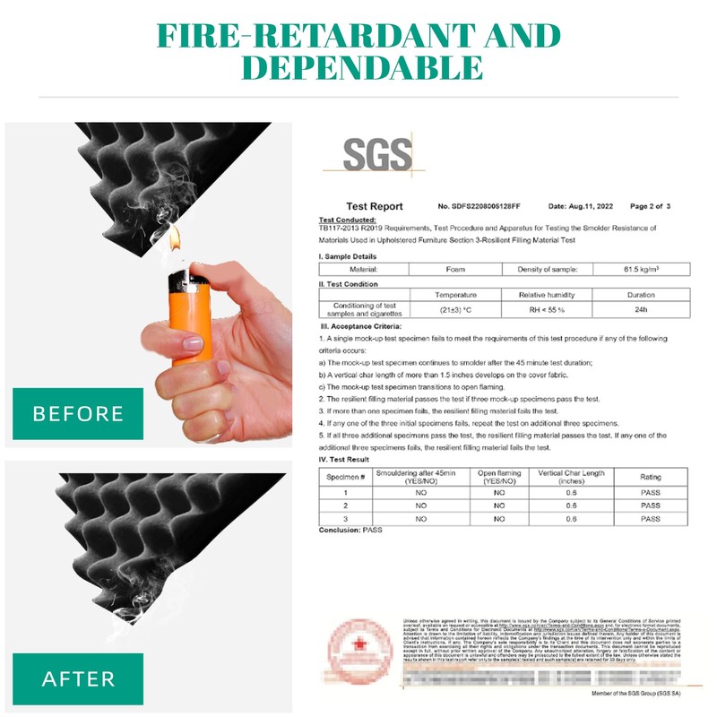 - [Safety and environmental protection]: The sound insulation board is made of 100% polyurethane foam, which is non-toxic, formaldehyde free, and health risk free. It has significant advantages in reducing sound and absorbing noise. Once the upgraded flame retardant foam sound-absorbing panel catches fire, it will automatically extinguish within 1 minute.