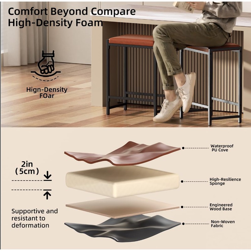 - High Quality Material: The PU leather composition makes these stools both wear- resistant and waterproof. The backless seat of the counter height bar stool is made of stain and scratch-resistant PU leather with soft foam cushion. Quality anti-scratch PU leather keeps your seat protected. And also the stain & water-resistant feature made the barstool chair quite easy to care.