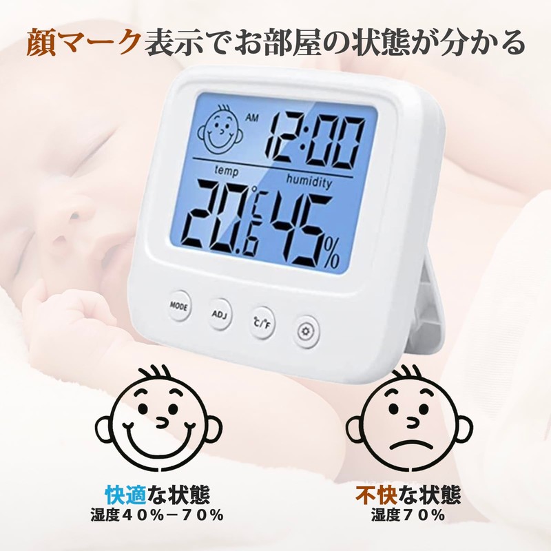 - (Emoticon Notifications) Baby Health Management, Office Desktop Hygrometer, Digital Thermometer, Digital Indoor Temperature and Hygrometer, Dual Use Type, Large LCD Screen, Compact, Moisturizes Skin, Prevents Inflation, Prevents Dryness, Heatstroke Prevention, Baby Present, White, Instructions Included