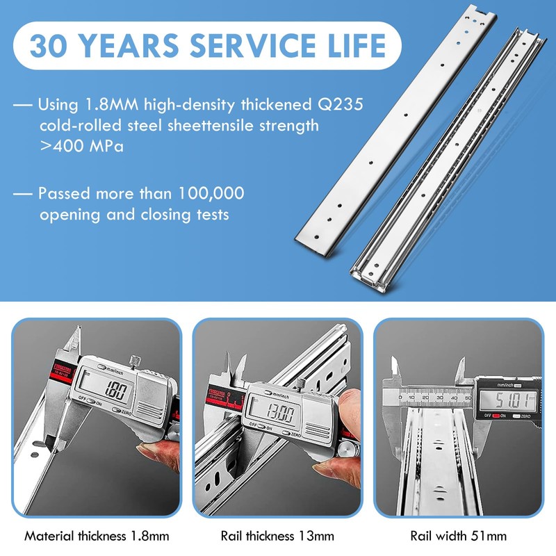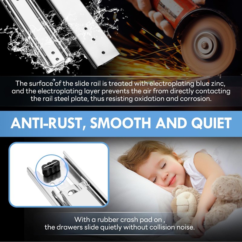 • 【Double anti-rust treatment】--The surface of the drawer slide is treated with electroplating + galvanized blue sealing process to prevent rust in case of water, so that you can use it with more peace of mind.