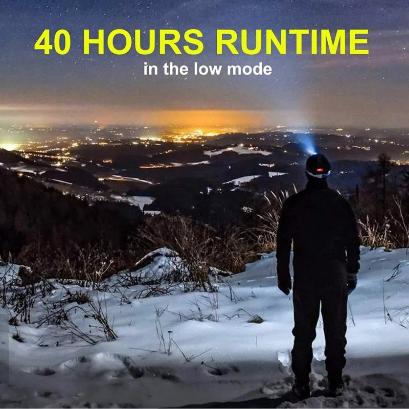 Cómoda linterna frontal recargable: esta linterna frontal viene con 2 baterías recargables USB de 1865 mAh, 1 adaptador de cargador y 1 cable de carga. Hasta 8 horas de uso continuo en modo brillo máximo y 40 horas en modo brillo bajo. La correa suave y ajustable para la cabeza garantiza comodidad y estabilidad.