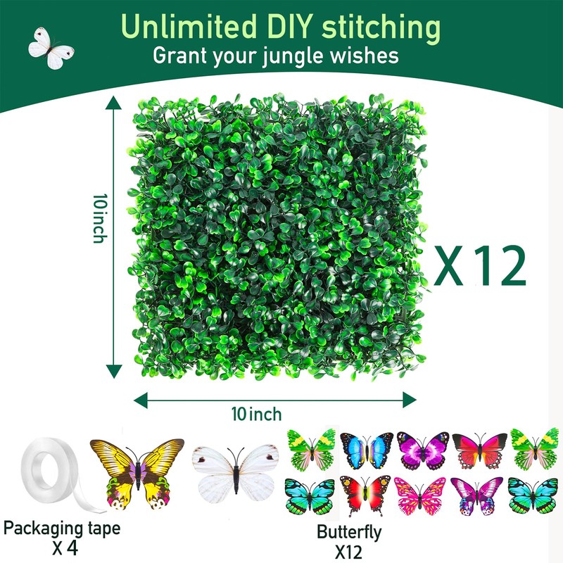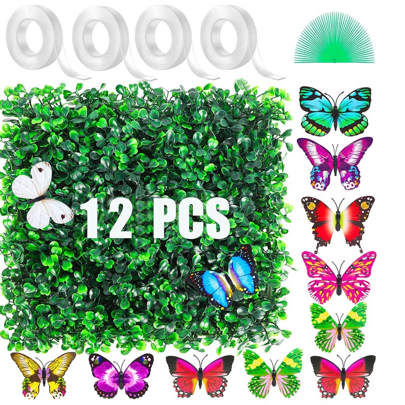 - 【Product List】:12 Packs Boxwood Panels Hedge and 12pcs random colorful PVC butterflies are provided,and 100 pieces zip tie to install and 4 rolls of nano double-sided tape make your decoration process more abundant and convenient.each boxwoodpanels size 10 x 10 in Can be divided freely according to the size you need.