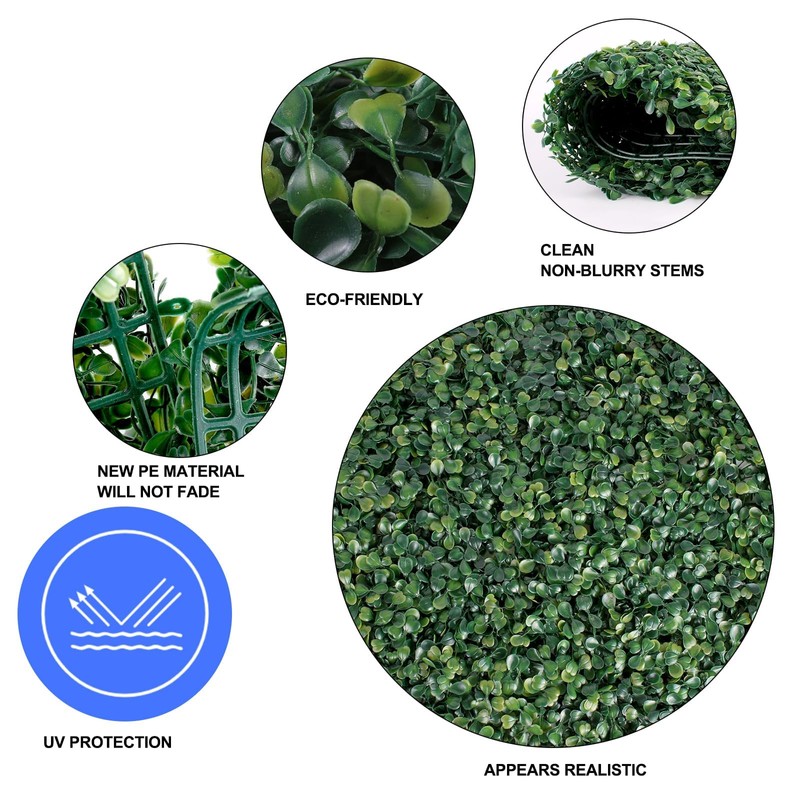 - 【Grass wall panels material】Premium PE Material The polyethylene material is odorless, environment friendly, and sun-proof, which can avoid the leaves fading quickly. Every season They do not wither or fade, even under harsh outdoor conditions