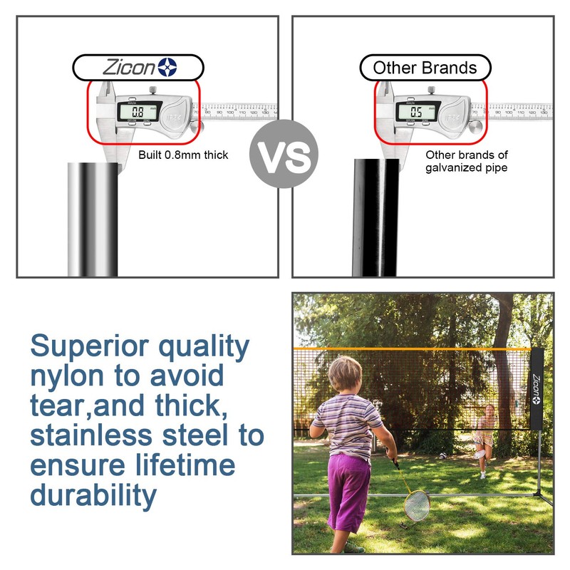 - -【Durable and Rust Resistant】Unlike most other similar net set's poles that make of thin and easy-to-fold galvanized pipes,Zicon badminton net set comes with stainless steel poles, and superior quality nylon net, to ensure rust and all weather resistant. With sturdy construction, you can use at various places without worries.