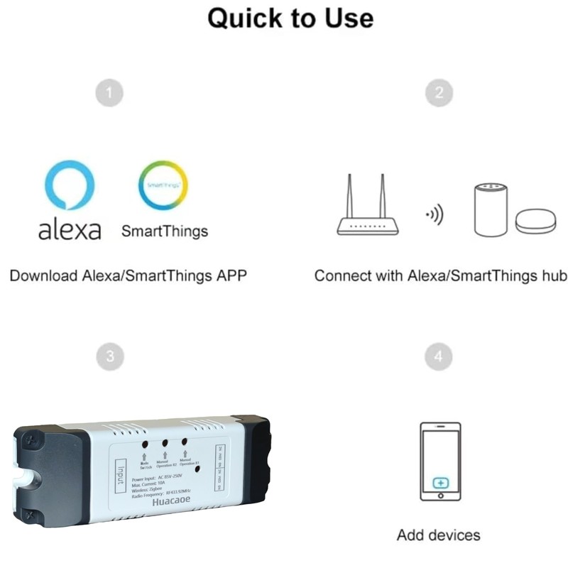 - Huacaoe 2 Channel Smart Wireless Zigbee Relay Switch,work with ewelink zigbee Bridge,tuya zigbee hub.Easy set up,work with Tuya Smart life Zigbee Gateway hub.Once configured with tuya app,then link to alexa app,then you can voice control each channel.If it's connected to alexa app directly through echo device with zigbee hub,it will be discovered as 1 channel only.