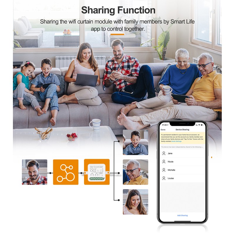 【Sharing Function】Sharing the WiFi curtain module with family members by Smart Life APP to control together.