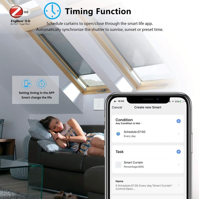 • App remote control: Download the free app [Smart Life, Tuya App] from the App Store or Google Play, you can control the opening or closing of the curtains/blinds/garage doors via the app. Requires Tuya ZigBee Hub, suitable for controlling multiple smart curtain panels.