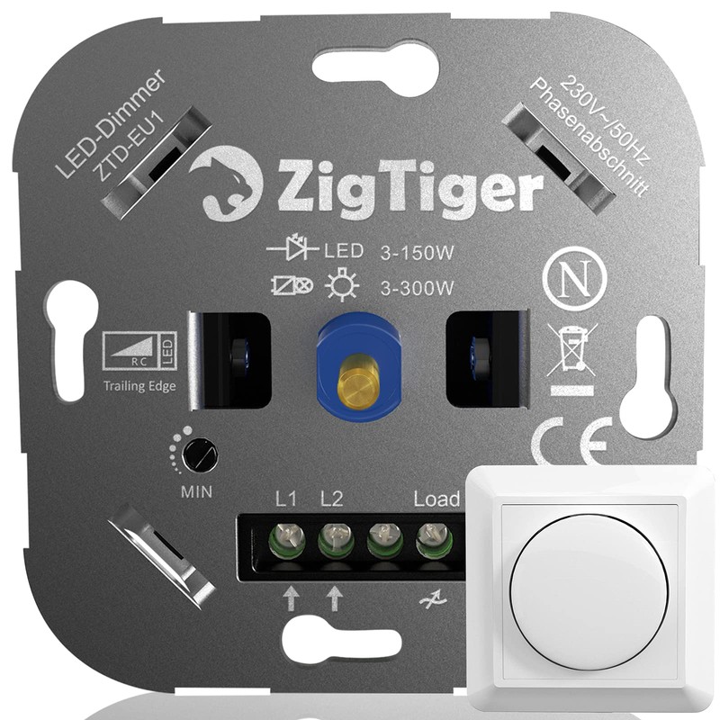 Zigtiger LED Dimmer Switch, Flush-Mounted Dimmer Switch, Rotary Dimmer Suitable for Dimmable LED 3-150 W and Halogen 3-300 W, No Clamping Claws, Phase Control, White