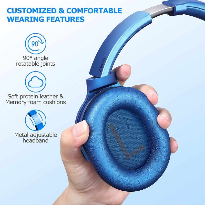 ZIHNIC Auriculares con cancelación activa de ruido, auriculares inalámbricos Bluetooth de 40 horas con sonido estéreo de alta fidelidad de graves profundos, auriculares sobre la oreja, cómodos auriculares para viajes/hogar/oficina (azul)