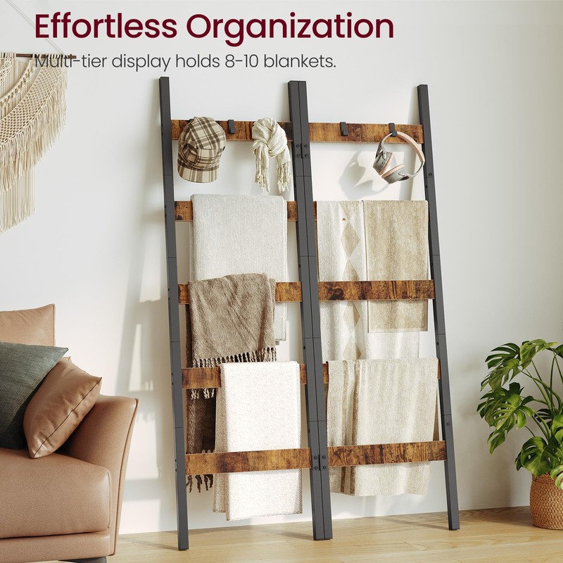 • Warm & inviting: Beautiful and practical, this ladder shelf adds charm to your space while keeping things organized. Use it to show off cozy blankets, stylish scarves, or even your favorite reads. With five movable hooks included, it offers smart storage wherever you need it.