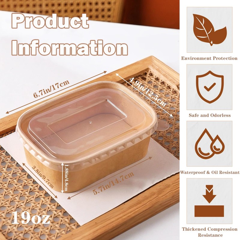 - Complete Set of 50 Meal Prep Containers:Includes 50 rectangular 19oz paper meal prep containers and 50 snap-fit lids. Each box measures 6.7”L x 4.7”W x 1.9”H—perfect for packing salads, grain bowls, or desserts for takeout, parties, or home use