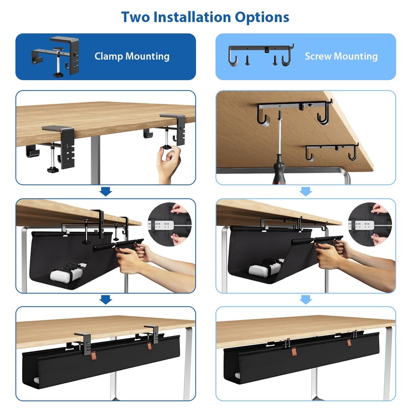 - 【Unique Two Ways Installations】This cord management under desk supports both no drill clamp on and screw fixing installation. Our no drill clamp on upgraded with 3 adjustable levels, is suitable for desktop thicknesses ranging from 0.4 to 2.4 inches, ensuring compatibility with metal, wood, or glass surfaces.