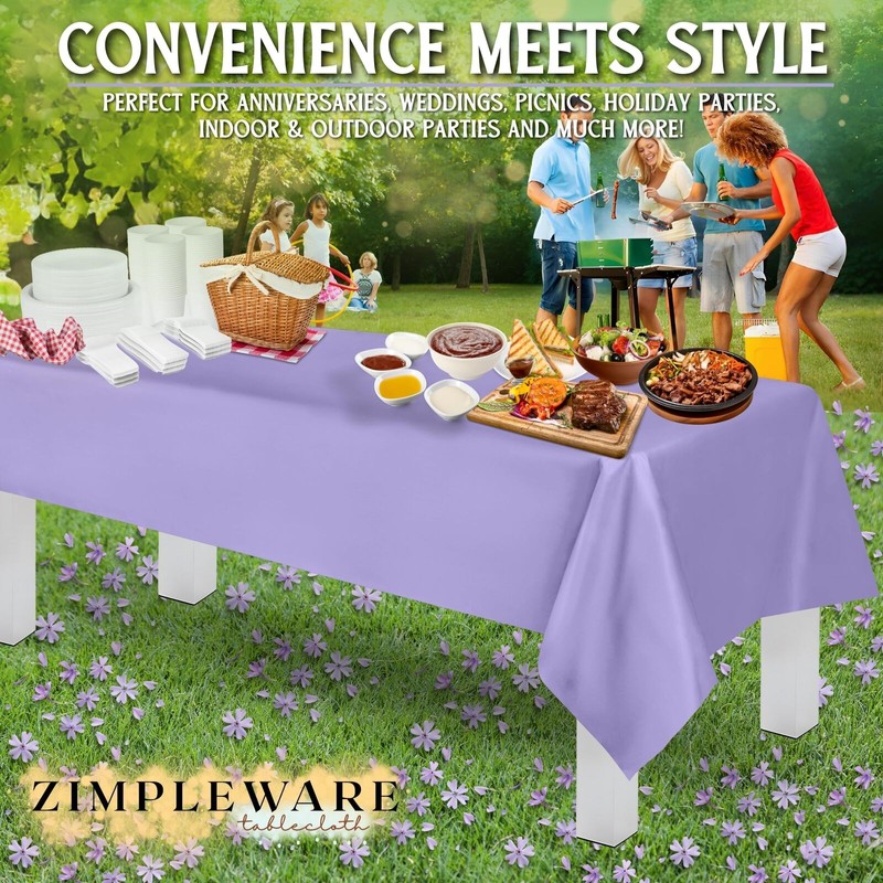 - High-Quality Material: Our Zimpleware Premium Disposable Lavender Plastic Tablecloth offers the perfect blend of luxury and convenience. Made from durable fade and tear-resistant plastic, this lavender plastic table cloth rectangle is designed to withstand spills and stains.