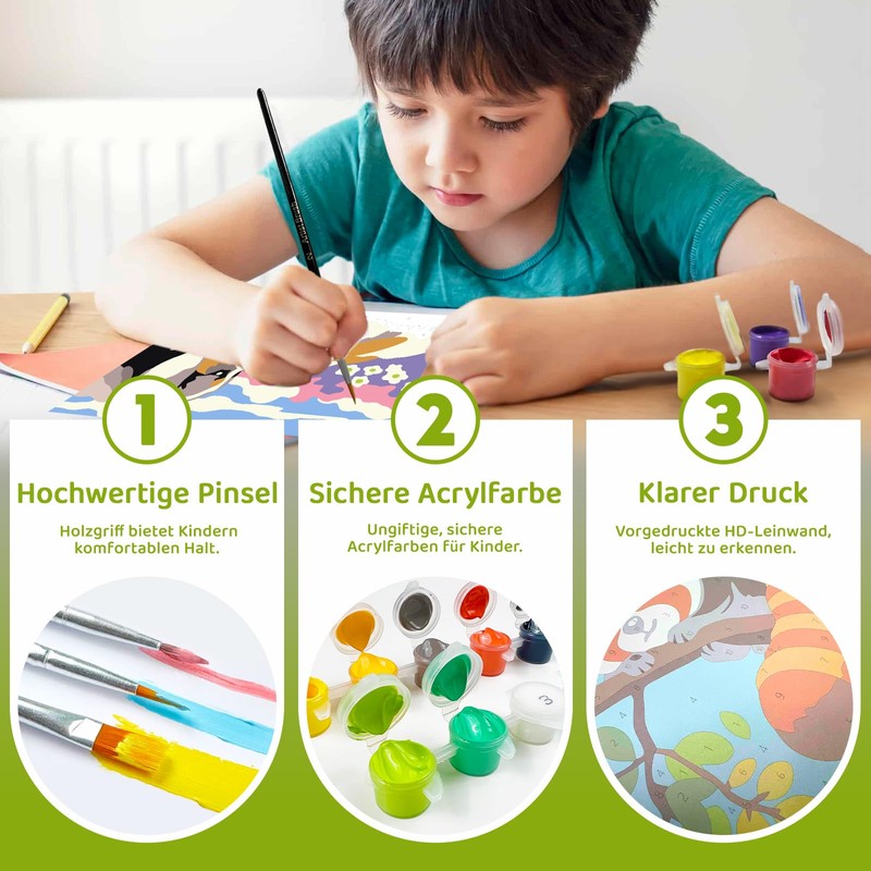 - The painting set contains: a clear printed painting board measuring 13 x 18 cm, a set of acrylic paints specially developed for children, three high-quality brushes (large, medium, small) and a matching picture frame.