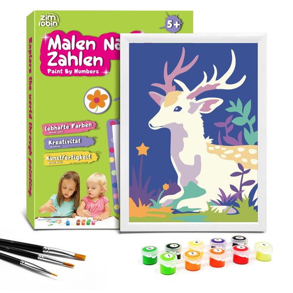 Zimrobin Paint by Numbers for Children - 13 x 18 cm Paint by Numbers Children from 5 6 7 Years Girls and Boys, Creative Gift with Frame, 3 Brushes and Acrylic Paints (Mysterious Deer)