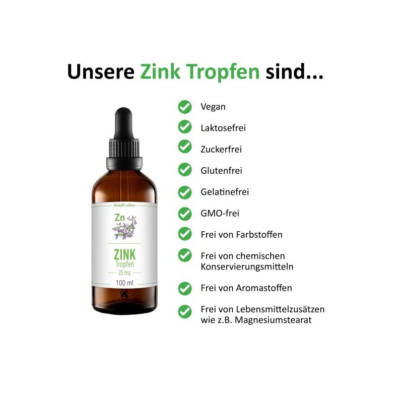 - Zinc 25 mg drops in a practical dropper bottle. Optimal absorption capacity and bioavailability thanks to liquid form. 100% vegan and without additives such as dyes and magnesium stearates. In an economical 100 ml brown glass bottle