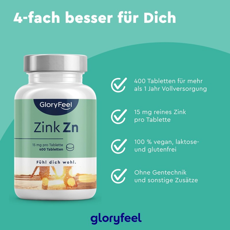 - 400 zinc tablets for over 1 year – 400 small, easy to swallow tablets each with 15 mg of pure zinc gluconate. Easy to use: only one tablet per day for more than one year (13 months) supply. Zinc needs differ depending on age and gender. Our zinc gluconate with 15 mg per tablet is ideal dosed for individual needs.
