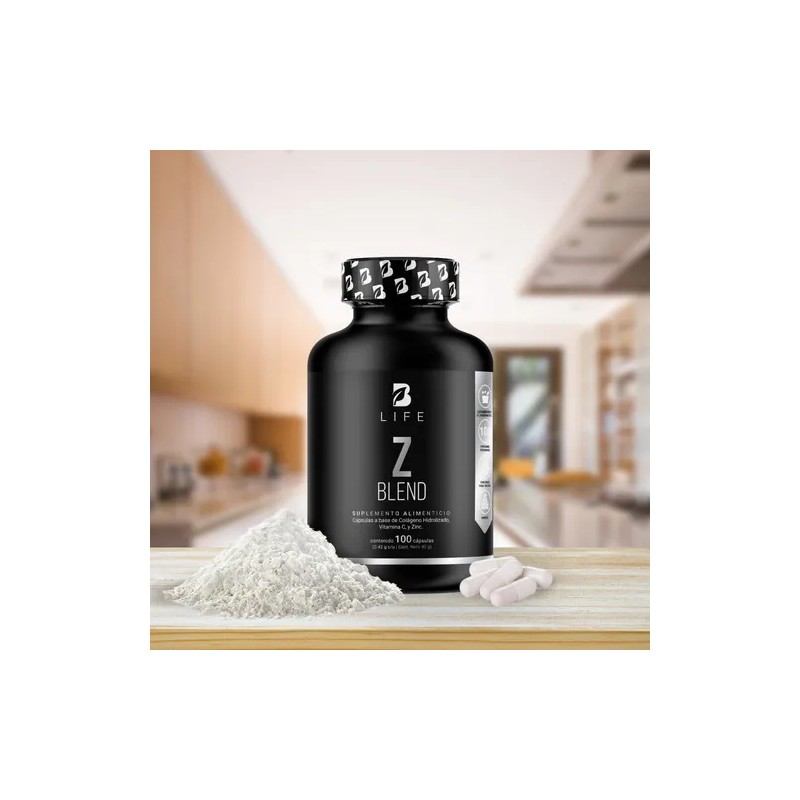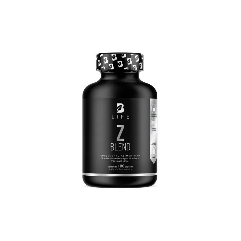 Z Blend B Life, protección y bienestar en cada porción. Cada cápsula de 420 mg ofrece una composición especial que combina Zinc, Vitamina C y Colágeno, una formulación única que integra minerales, vitaminas y proteínas esenciales para tu vitalidad. Esta poderosa combinación no la encontrarás en otras presentaciones. Contiene 100 cápsulas.