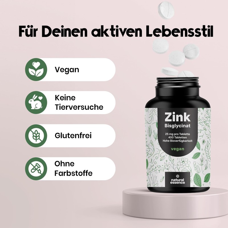 Discover the high-quality zinc source with the zinc tablets from Natural Essence. Our tablets contain 25 mg of zinc bisglycinate per tablet - a particularly prized form of zinc. They are vegan, free from unwanted additives and well tolerated. Thanks to their smooth surface, they are easy to swallow and have no unpleasant aftertaste. With 400 pieces per pack, they provide a practical addition to everyday needs.