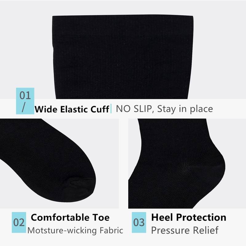 - Quality and comfort: breathable high-performance fabric keeps an optimal temperature. Breathable fabric wicks moisture away from your skin to ensure you feel fresh and comfortable. They fit snugly from toe to knee, invigorate your skin. Comfortable wide top band prevents rolling, delivers 360 degree stretch for greater flexibility and durability. These compression socks can prevent cramps, fatigue, swelling and help with muscle recovery, varicose veins and diabetics.