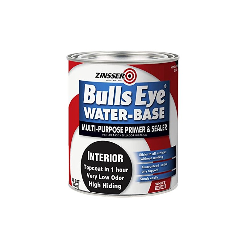Zinsser Bulls Eye Water-Base Primer and Sealer primes interior surfaces while blocking stains in just one pass. The fast-drying, low-odor formula creates a flat, sandable finish that works with all top coats. Primer adheres to all surfaces, even glossy ones, without sanding.