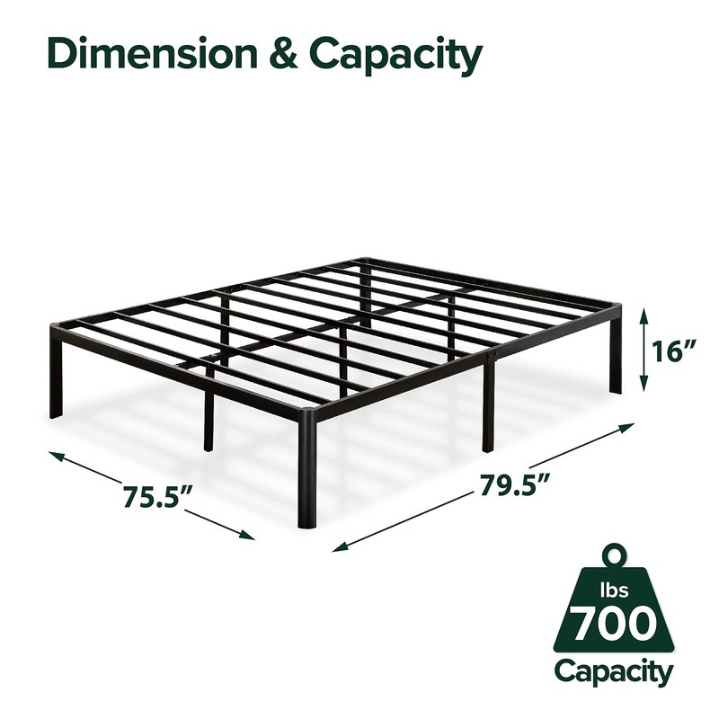 The Van steel 16 inch metal platform bed by Zinus provides strong support for your memory foam, latex, or spring mattress. This platform bed is 16 inches high with clearance under the frame for valuable under bed storage. The Zinus Van metal platform bed provides reliable and durable mattress support. Mattress sold separately.
