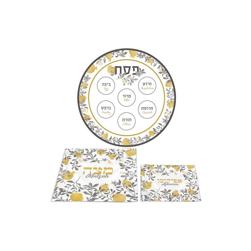 - Traditional Seder Set - Decorated with exquisite gold pomegranates connected to its branches, The Seder plate says "Pesach" and the Matza cover bears the words "Matzah" "מצה" (flatbread) and Afikoman bag words "אפיקימון" "Afikoman" in Hebrew and English. The design is silk-screened.