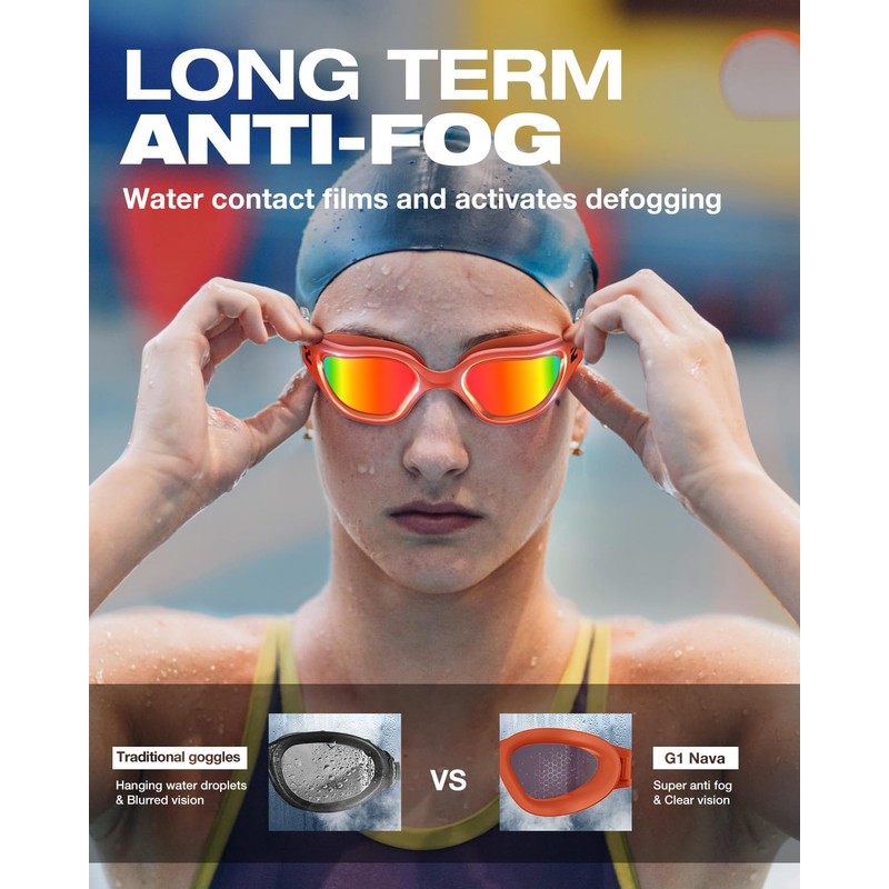 - UV Protection, Clear Vision: G1 Nava Swim Goggles protect against UV rays and enhance vision in any lighting. The anti-fog coating ensures clear vision, while the comfortable fit makes them perfect for long wear. Ideal for both indoor and outdoor swimming.