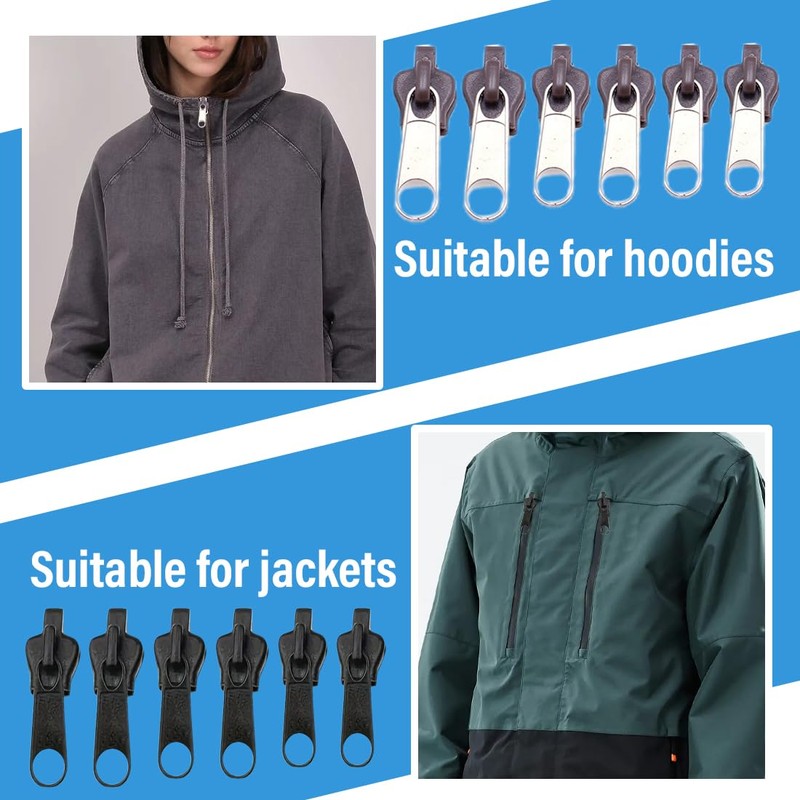 Zip Slider Replacement, Pack of 12, Universal Zip Repair Kit for Clothes, Removable Zipper, Pull Fixer Zip, for Clothes, Backpack, Luggage, Sleeping Bag