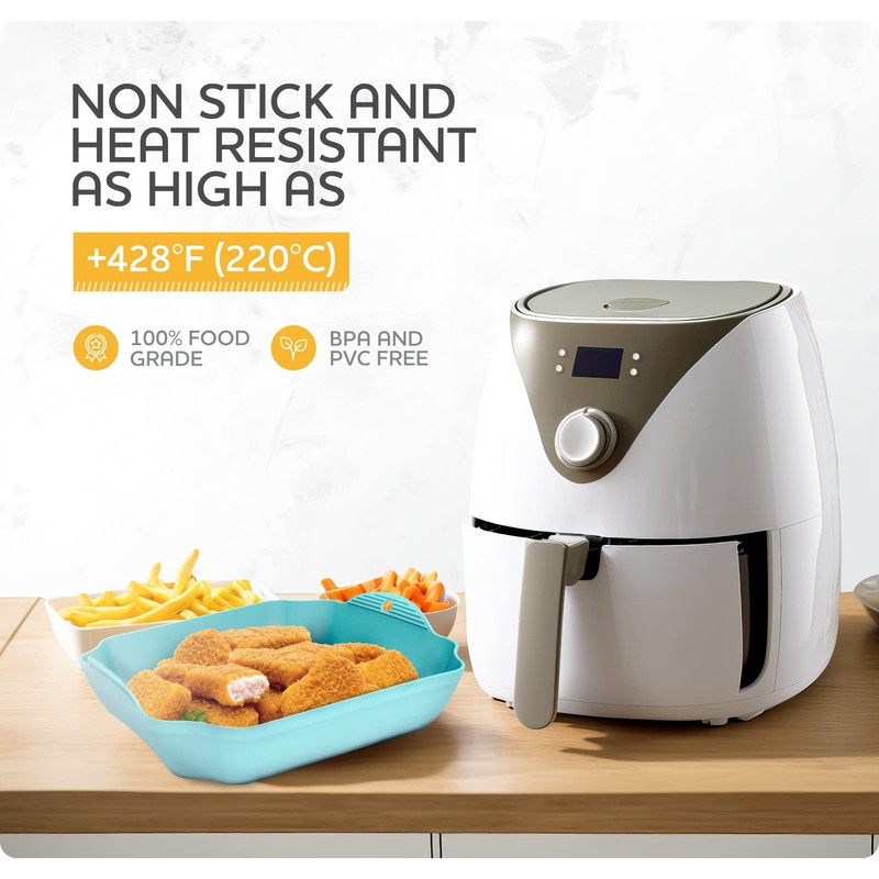• BPA-FREE FOOD GRADE SILICONE: 7.5 square air fryer liners made from nonstick & nontoxic silicone. Dishwasher-safe, stain-resistant, easy to clean. Air fryer oven trays don't retain smells, grime or greasy residue