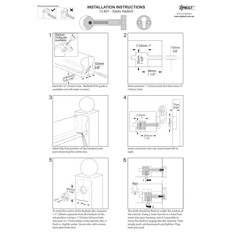 Zipbolt 13.810 Slipfix Railbolt — Staircase Handrail Post to Post Fastening Solution, Durable, Fast, and Easy Residential and Commercial Installation, New Construction and Remodels