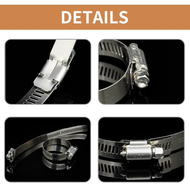 - Hose clamp set clamping range from 6 to 29mm (1/4inch, 3/8inch, 1/2inch, 5/8inch, 3/4inch, 1inch).