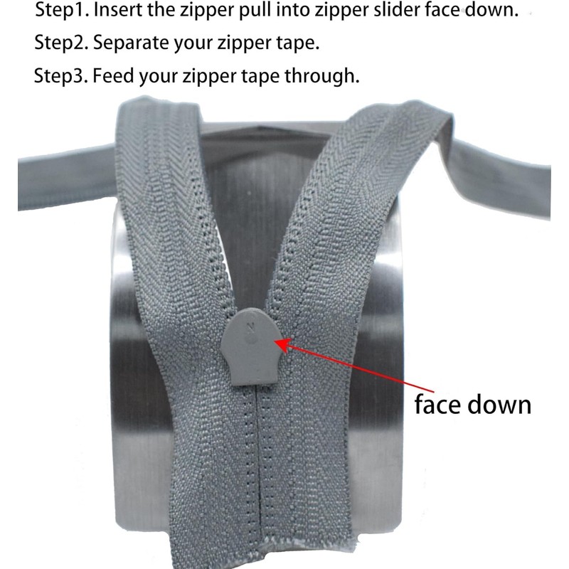 - Easy to Use: Firstly stick the zipper jig to your workbench or counter, which will help you prevent the zipper jig tool from slipping. And then insert the zipper pull into the zipper slider face down, separate your zipper tape and feed your zipper tape through.
