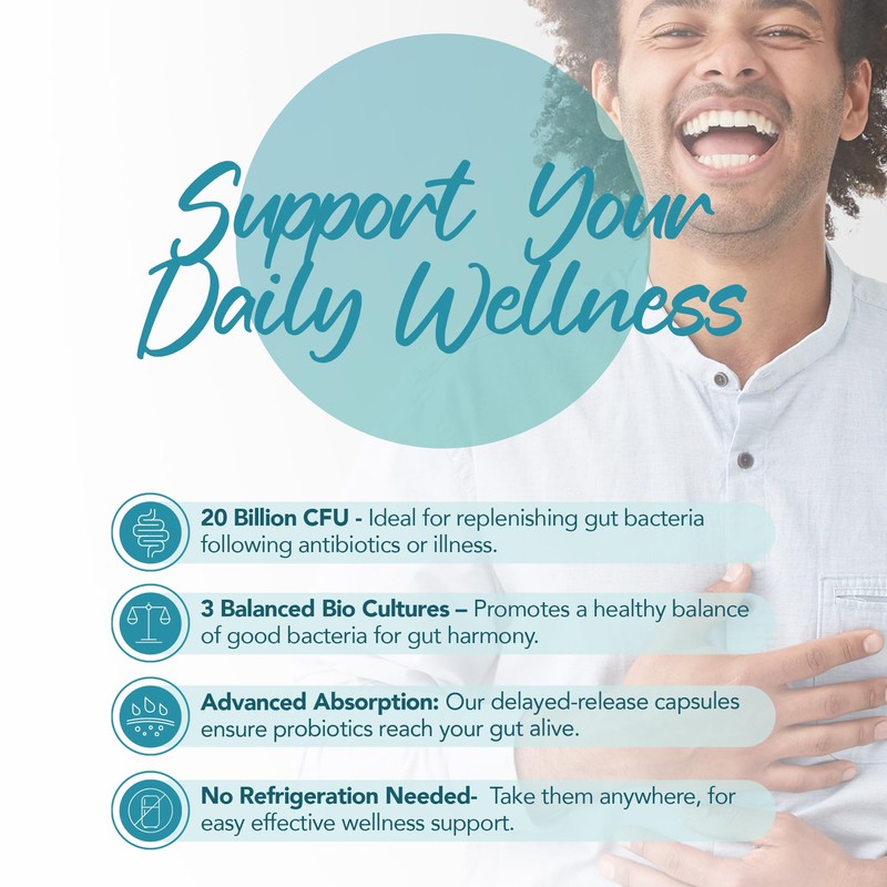 - Powerful 20 Billion CFU Formula: Each capsule is packed with probiotics, delivering a high-strength dose of probiotics 20 billion CFU from three carefully chosen strains: Lactobacillus plantarum (5 billion CFU), Lactobacillus rhamnosus (10 billion CFU), and Bifidobacterium animalis (5 billion CFU). This multi strain probiotic is a simple way to support your wellness every day.