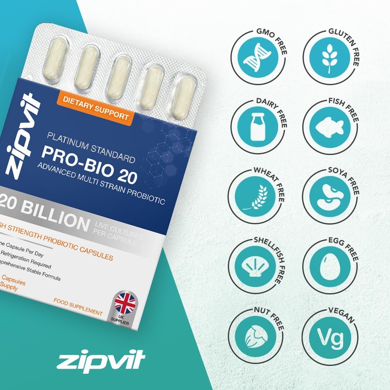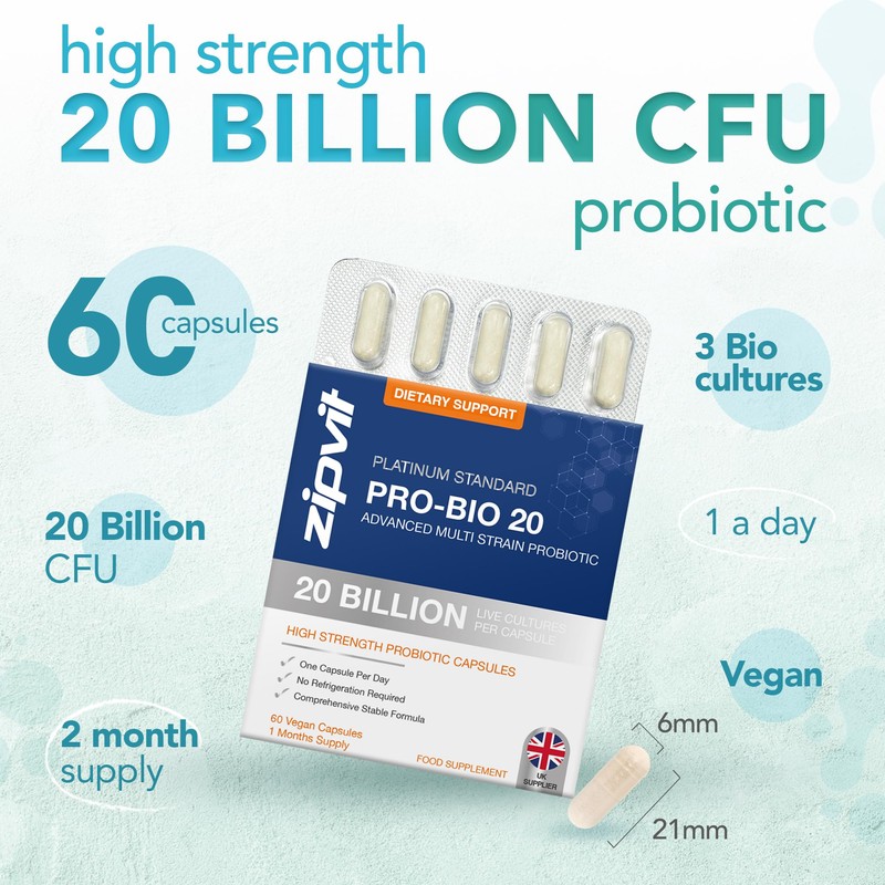 Zipvit Pro Bio 20 Billion CFU Probiotics for Gut Health, High Strength, 60 Vegan Probiotic Capsules for Men & Women, 3 Live Bacterial Cultures, Lactobacillus & Bifidobacterium Animalis