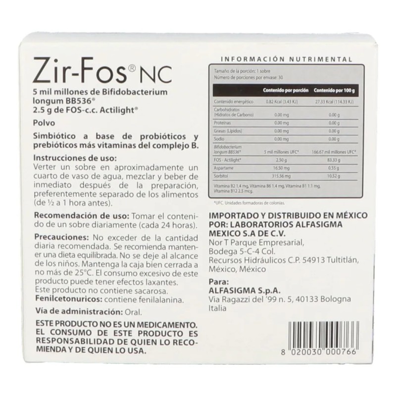 Entre sus características clave, Zir-Fos es un suplemento de uso nutricional que actúa como un importante complemento alimenticio. Su formulación ha sido creada para ser eficaz en los desequilibrios de la flora intestinal, ayudando a restaurar el balance de microorganismos beneficiosos en el intestino. Al ser sin sabor, puede mezclarse fácilmente con agua o alimentos sin alterar su gusto.