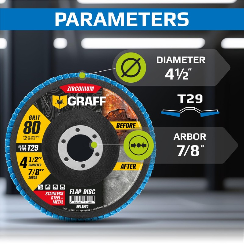 - TECHNICAL CHARACTERISTICS - Diameter: 4 1/2 Inch, Arbor: 7/8 Inch, Grit: 80Z, Maximum speed: 13200 RPM. Suitable for heavy duty work.