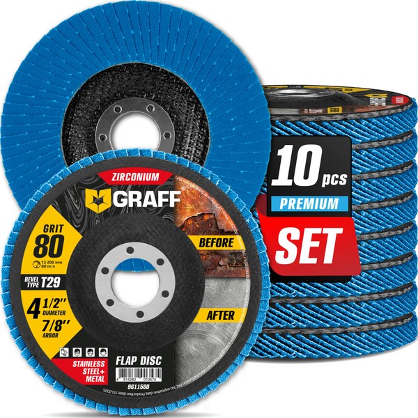 Zirconia Flap Discs 4 1/2 for Angle Grinder - 80 Grit Flap Wheels for Stainless Steel and Sheet Metal - Grinder Sanding Disc 7/8 Arbor (10 Pack) GRAFF