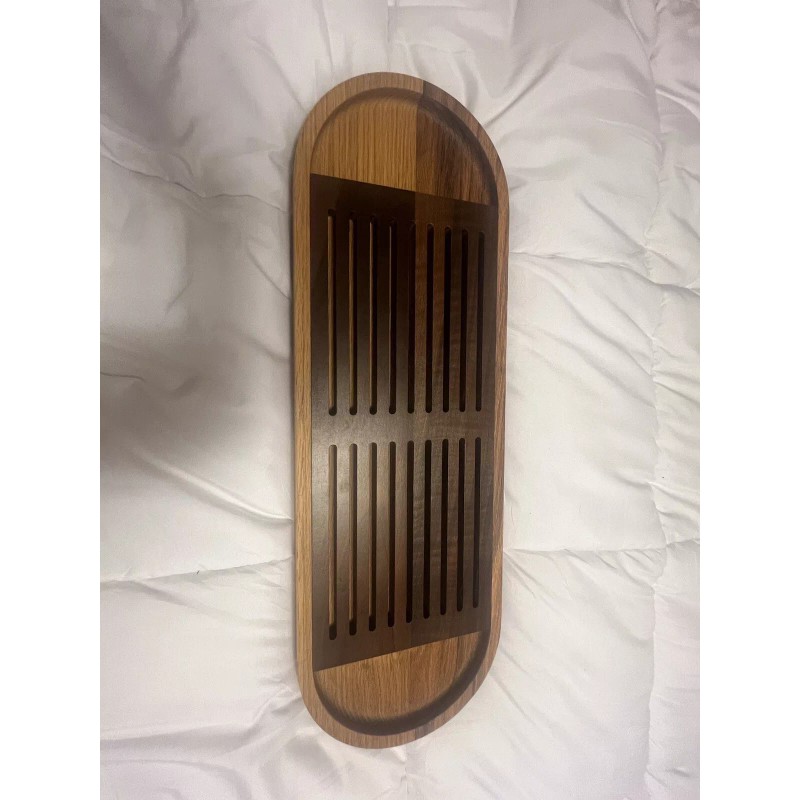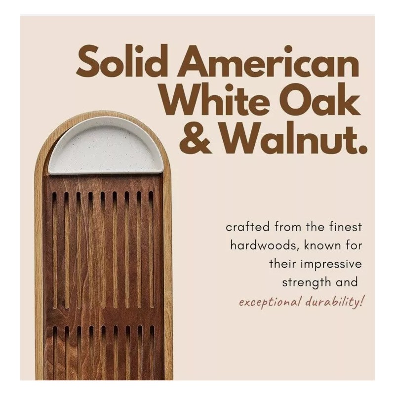 Elevate your serving game and impress your guests with the Ziruma Marvelous Bread Cutting Board and Serving Tray—a 4-piece set. Made of high-quality wood with a beautiful walnut pattern, this medium-sized oblong tray has two dipping bowls and a crumb catching tray. It is also ideal for serving chips with dip or crackers with cheese. It is not just a feast for the eyes but also a practical addition to your kitchen and dining area—perfect for organizing your snacks, fruits, or even bread loaves (with a crumb catching tray), making it an ideal centerpiece for any gathering.