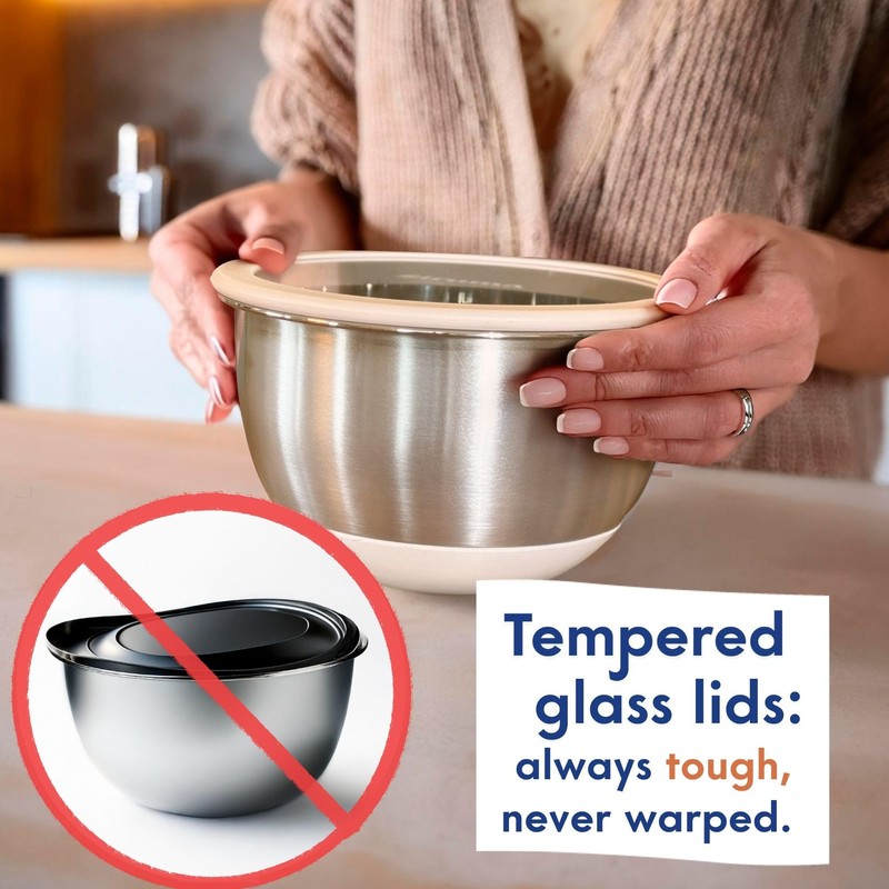 - โ ๐๐๐ฟ๐ฎ๐ฏ๐น๐ฒ ๐๐น๐ฎ๐๐ ๐๐ถ๐ฑ๐โ No Warping, No Cracking โ Say goodbye to flimsy plastic lids! These stainless steel mixing bowls come with sturdy, dishwasher-safe glass lids that keep their shape and seal in freshness.