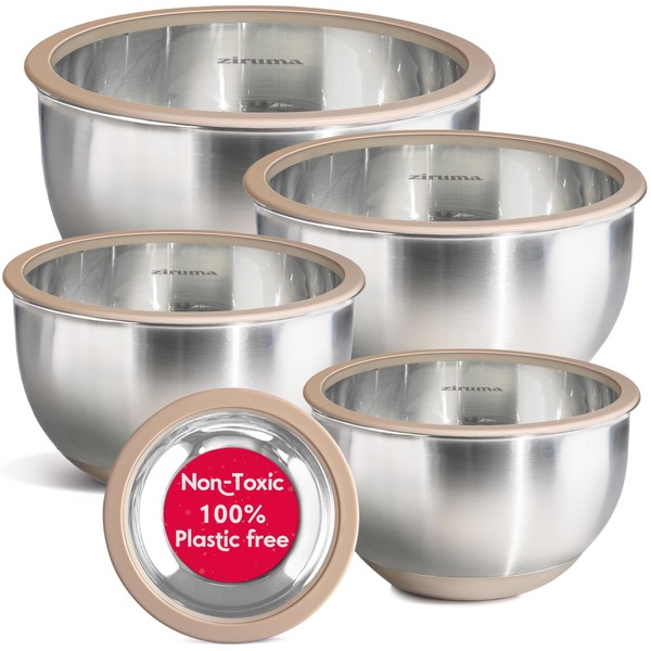 Ziruma Non-Toxic Mixing Bowls with Lids Set, Stainless Steel & Glass, 5 Pcs Plastic Free Bowls with Silicone Non-Slip Base, Dishwasher Safe Mixing Bowl Set