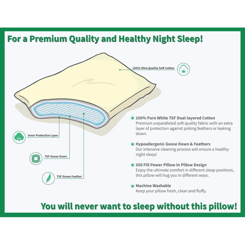 Our famous and focus Group tested premium down and feather pillow will give you the sleep at night you deserve. This feather and down structure combination will get you to fall asleep in no time and develop the cozy relationship you should have with your soft and comfortable pillow. Don't settle for just a feather pillow, choose the premium one that has the perfect ingredients to have you WAKE up in the morning rested like never before. Our TSF 100Percent dual-layered 230 thread count cotton will ensure the comfort and structure of the feather and down are in place, without having them poking out at you at night. The pillow and pillow design includes 2 chambers of coziness to give you the most long lasting comfort and fluffiness without having the pillow go flat. 30 nights of comfort guarantee with hassle free return policy; we are so confident that you will be as happy as so many others that have tried this pillow and couldn't sleep on any other pillow thereafter. If for any reason you should decide to return your pillow you will be able to do so without any hesitation or hassle! When purchasing from The Sleep Factory, be confident that you have a team of experts and customer support behind you. Your 100Percent satisfaction and a good night sleep is the #1 priority. You deserve it! Pillow specifications: size & fill weight: - Standard - 20x26/31oz- Queen - 20x30/39.5oz- King - 20x36/49.8oz- Inner chamber 85 Percent goose feather- Outer chamber 15 Percent goose down -- 100 Percent dual-layered cotton TSF premium weave down proof fabric with double needle sewn edge - 550 fill power Care and fluffing: The pillow includes clear instructions on how to keep your pillow fluffy at all times. Machine washable/dryable - keep your pillow fresh, clean and fluffy.